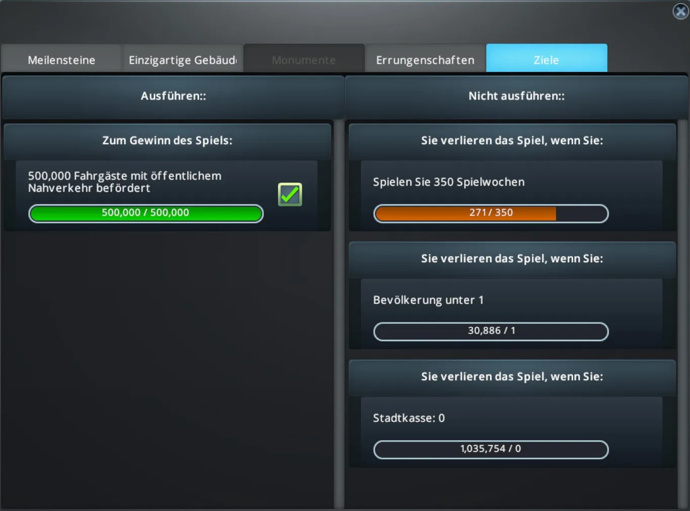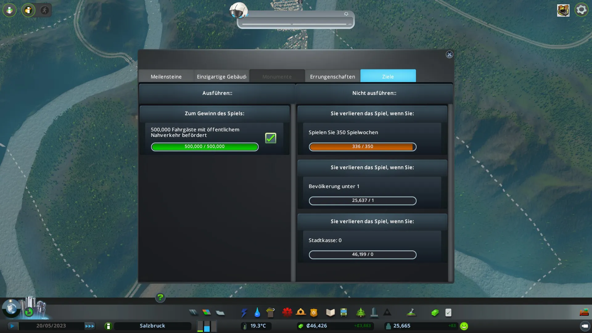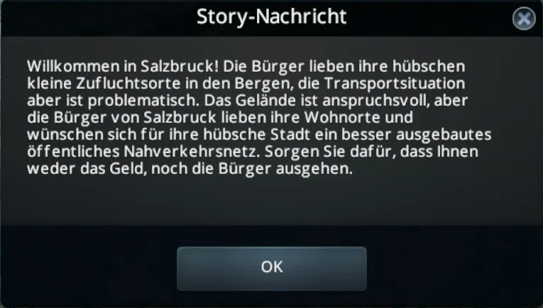 Okay, wir sollen also innerhalb von maximal 350 Spielwochen eine halbe Million Cims mit unserem Nahverkehr transportieren, während die Anzahl der Bevölkerung sowie der Kontostand der Stadtkasse nicht auf Null fallen dürfen.