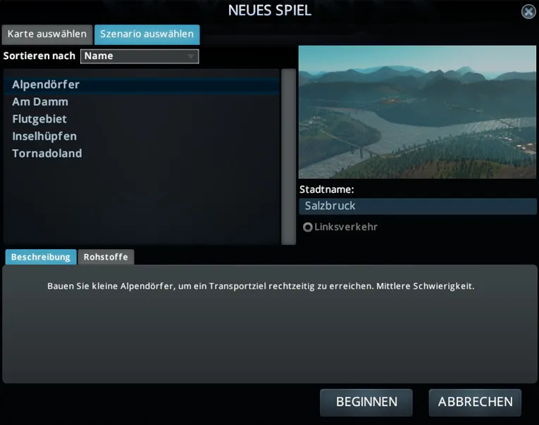 "Alpendörfer" ist eines von fünf Szenarien, die mit dem DLC "Natural Disasters" (Naturkatastrophen) veröffentlicht wurden, und dürfte mit seinem mittleren Schwierigkeitsgrad auch für versierte Städtebauer noch einigermaßen herausfordernd sein.