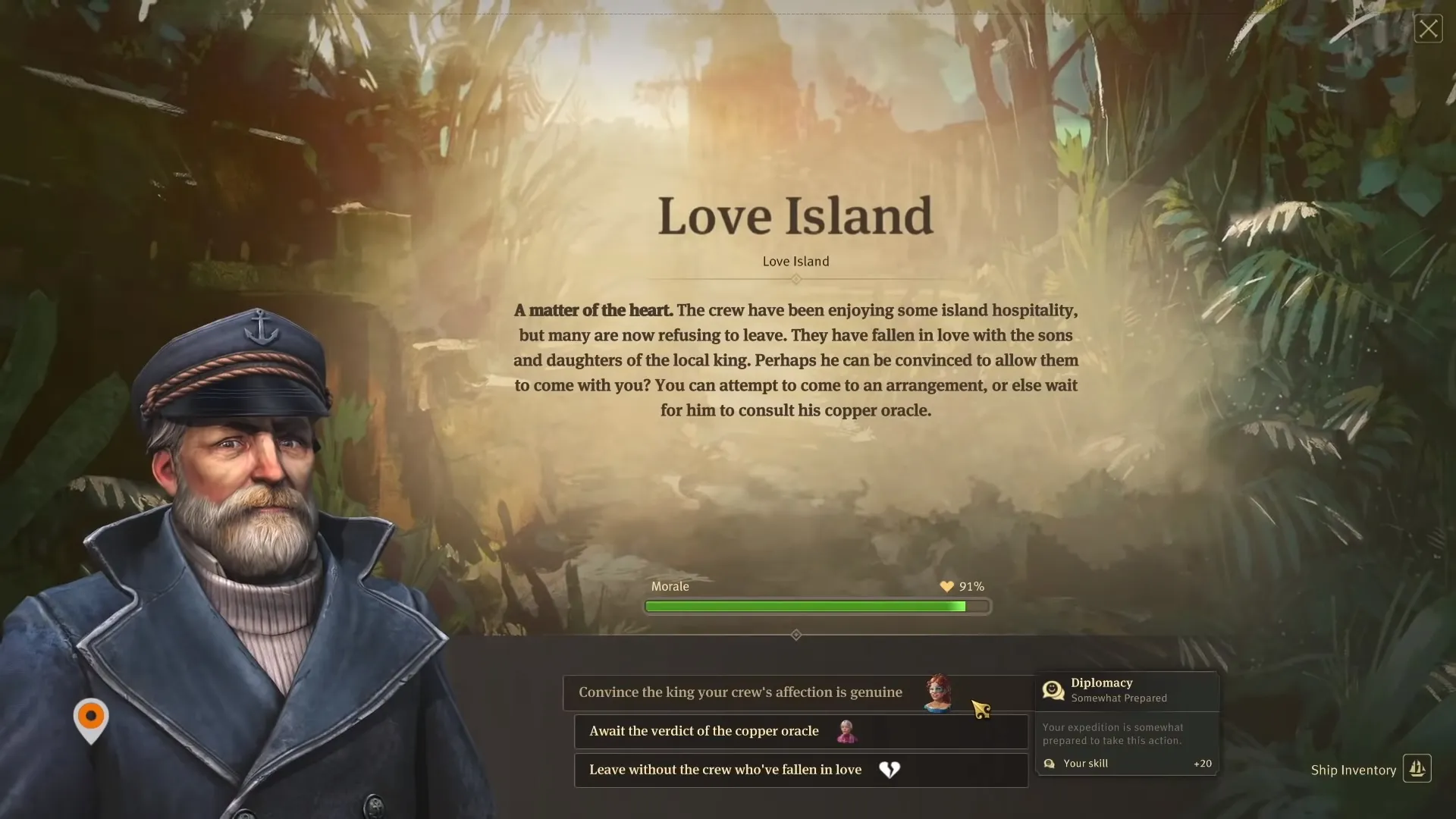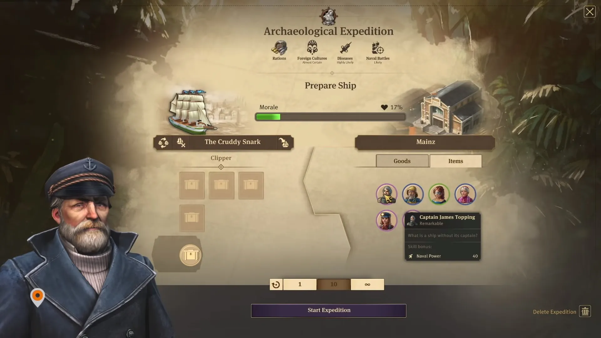 Nehmen wir die Expedition an rüsten wir unser Schiff entsprechend mit Proviant und Items aus. Weiterhin müssen wir auch die Moral der Schiffsmannschaft beachten. Ist alles optimal stehen die Chancen gut dass die Expedition erfolgreich verläuft.