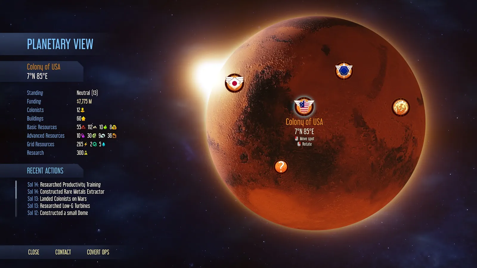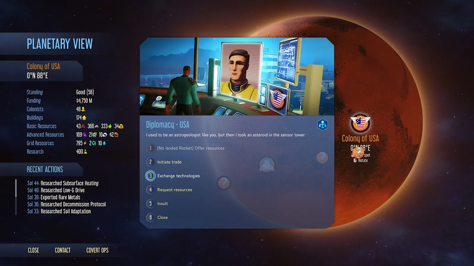 Während ihr die Kolonien eurer Konkurrenten nicht direkt beobachten könnt, können Sie die Position auf der neuen Planetenansicht jederzeit während des Spiels sehen. Dort können Sie den Status, die Ressourcen und Informationen zu Ihrem Rivalen sehen - hat die US-Kolonie gerade Produktivitätsschulungen erforscht? - interessant, vielleicht sollten wir einige Technologien austauschen.