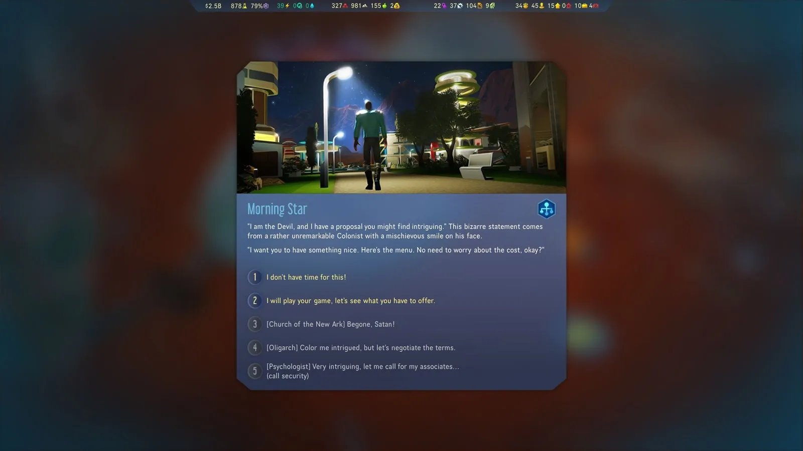 Sie können sich an andere Kolonien wenden und Technologien austauschen oder Handelsrouten eröffnen. Sie können sogar Ihre gesamte Volkswirtschaft auf der Grundlage des Handels mit anderen Kolonien aufbauen - spezialisiert auf die Herstellung einer Ressource, während Sie für andere Tauschgeschäfte tätigen. Sie können auch Hilfe anfordern oder einer anderen Kolonie helfen.