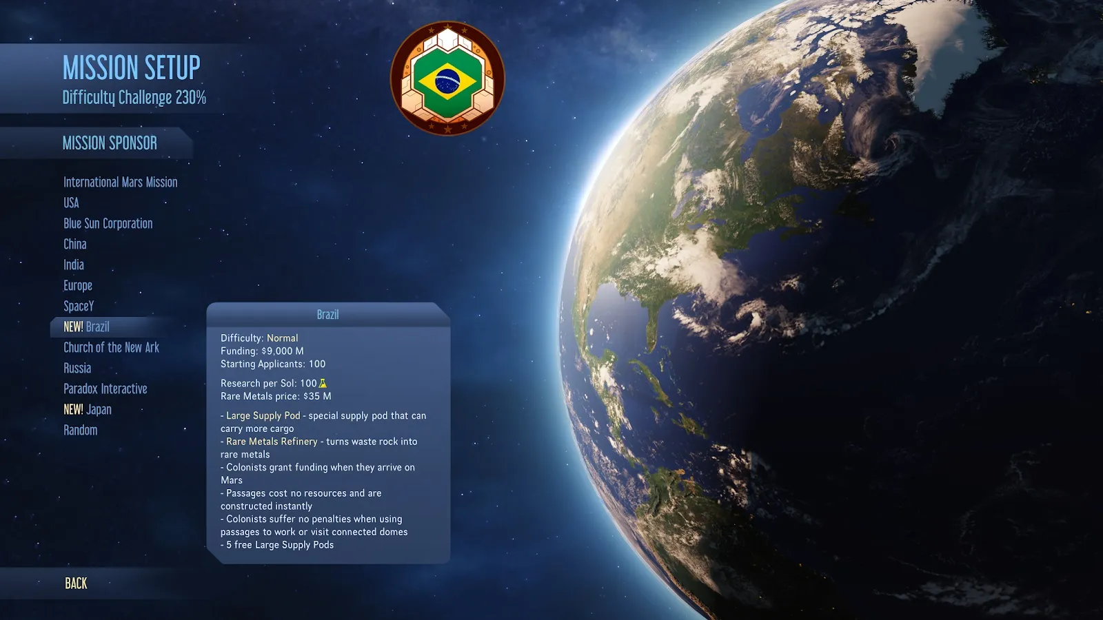 Japan nutzt die niedlichen neuen Wespen-Drohnen die fliegen können, und konzentriert sich auf Automatisierung und stärkere Spezialisten. Brasilien verfügt über das Seltene Metall Raffinerie-Gebäude, in dem Abfallgestein in seltene Metalle verwandelt werden kann und bekommt höhere preise für seltene Metalle. Außerdem erhält Brasilien Finanzmittel von ankommenden Kolonisten, da sie einer der reicheren Sponsoren sind, sodass Sie sich stärker auf Importe aus der Erde verlassen können.