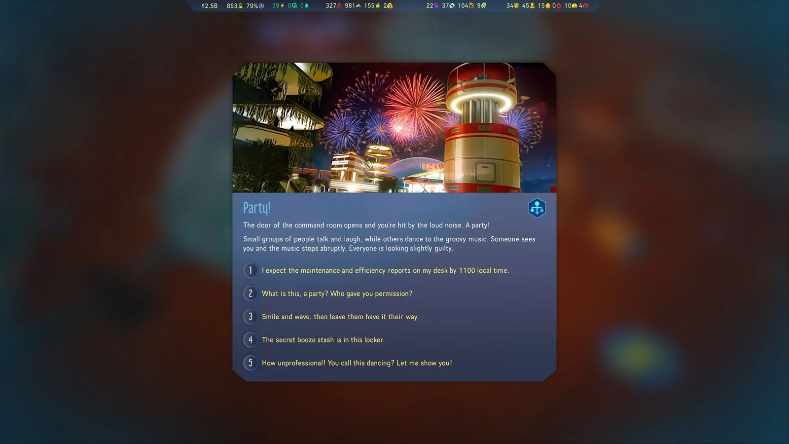 Wir haben mehr als hundert Ereignisketten hinzugefügt, von denen jede eine andere Geschichte über das Leben auf dem Mars mit mehr als 250 einzelnen Ereignissen erzählt. Vielleicht hat ein Staubsturm eine Hauptstörung in einem Fusionsreaktor verursacht oder ein Überläufer sabotierte den Start einer Rakete, die zur Erde zurückkehrt ... Manchmal ist es einfach interessant zu sehen, wie sich Menschen auf dem roten Planeten entspannen und Spaß haben
