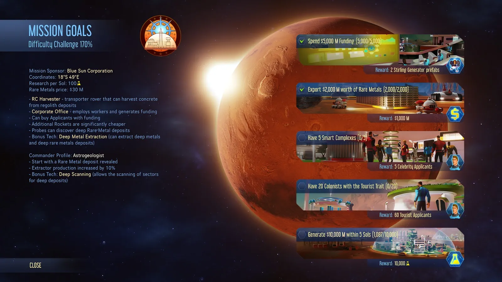 Die Sponsoren Ziele sind eine überarbeitung und verbesserung der bisherigen Missionsziele, welche mit dem kommendem Update wegfallen werden. Wenn ihr alle fünf Ziele erreicht haben, erhalten Sie einen Meilenstein, da Ihr Sponsor die Lebensfähigkeit Ihrer Mars-Kolonie anerkennt.