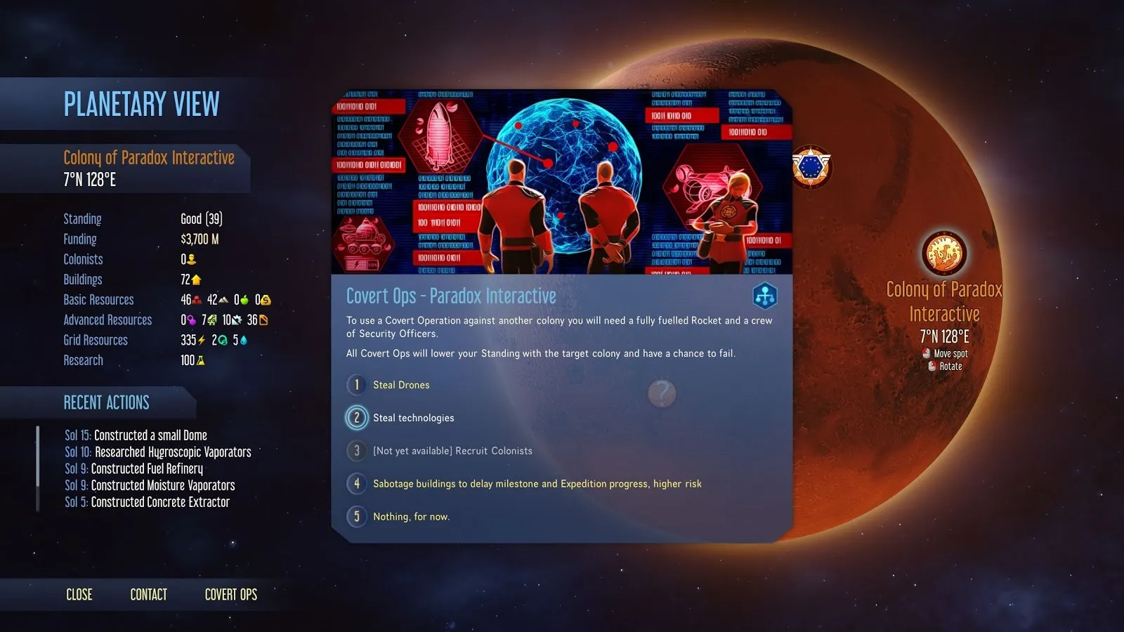 Verdeckte Operationen sind eine weitere Möglichkeit, mit anderen Kolonien auf dem Mars zu interagieren. Sie können Drohnen und Techniker stehlen, Gebäude sabotieren und sogar die besten Kolonisten in Ihre eigene Kolonie ziehen. Dafür benötigen Sie einige Sicherheitsbeamte und eine Rakete. Seien Sie gewarnt - Ihre reputation wird bei der rivalisierenden Kolonie wird sinken und wenn die Sicherheitsmaßnahmen verschärft werden verlieren Sie möglicherweise das verdeckte Einsatzteam und sogar die Rakete!