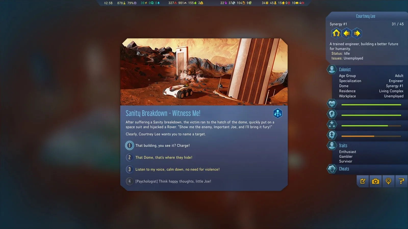Wir verwenden Events auch, um bestimmten Spielmechaniken mehr Gewicht und Abwechslung zu verleihen. Viele Abtrünnige in der Kolonie zu haben, kann dazu führen, dass eine ganzer Kuppel abtrünnig wird und seine Unabhängigkeit erklärt. Wenn ein Kolonist aus Mangel an mentaler gesundheit überschnappt, kann ein Ereignis auftreten, in dem der Kolonist sich selbst in einem Gebäude verbarrikadiert und sich weigert, herauszukommen.