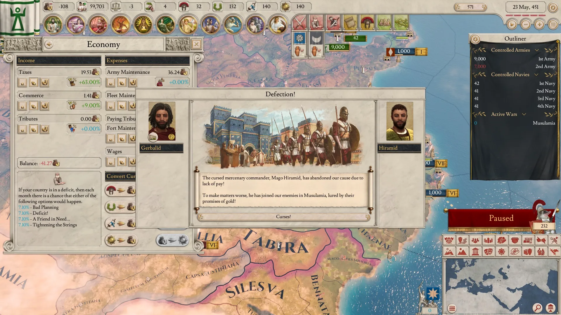 Zu guter Letzt: Wenn du nicht in der Lage bist, deine Söldner zu bezahlen, wirst du vielleicht feststellen, dass das bei ihnen für ziemliche Unzufriedenheit sorgt. Unter den verschiedenen möglichen Ereignissen, die als Folge einer in der Kreide stehenden Schatzkammer (wie im Tagebuch zur Wirtschaft erwähnt) auftreten können, ist, dass Söldner anbieten könnten, sich der gegnerischen Seite in einem laufenden Krieg anzuschließen.