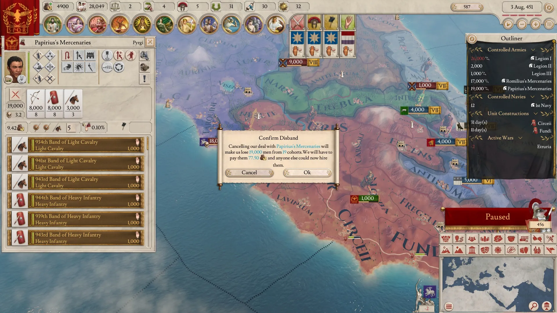 Wie jede Armee kannst du auch eine Söldnerarmee jederzeit auflösen, wenn sie sich nicht im Kampf befindet. Ihre erhöhten Unterhaltskosten bedeuten jedoch auch, dass die Auflösung sehr kostspielig sein kann.