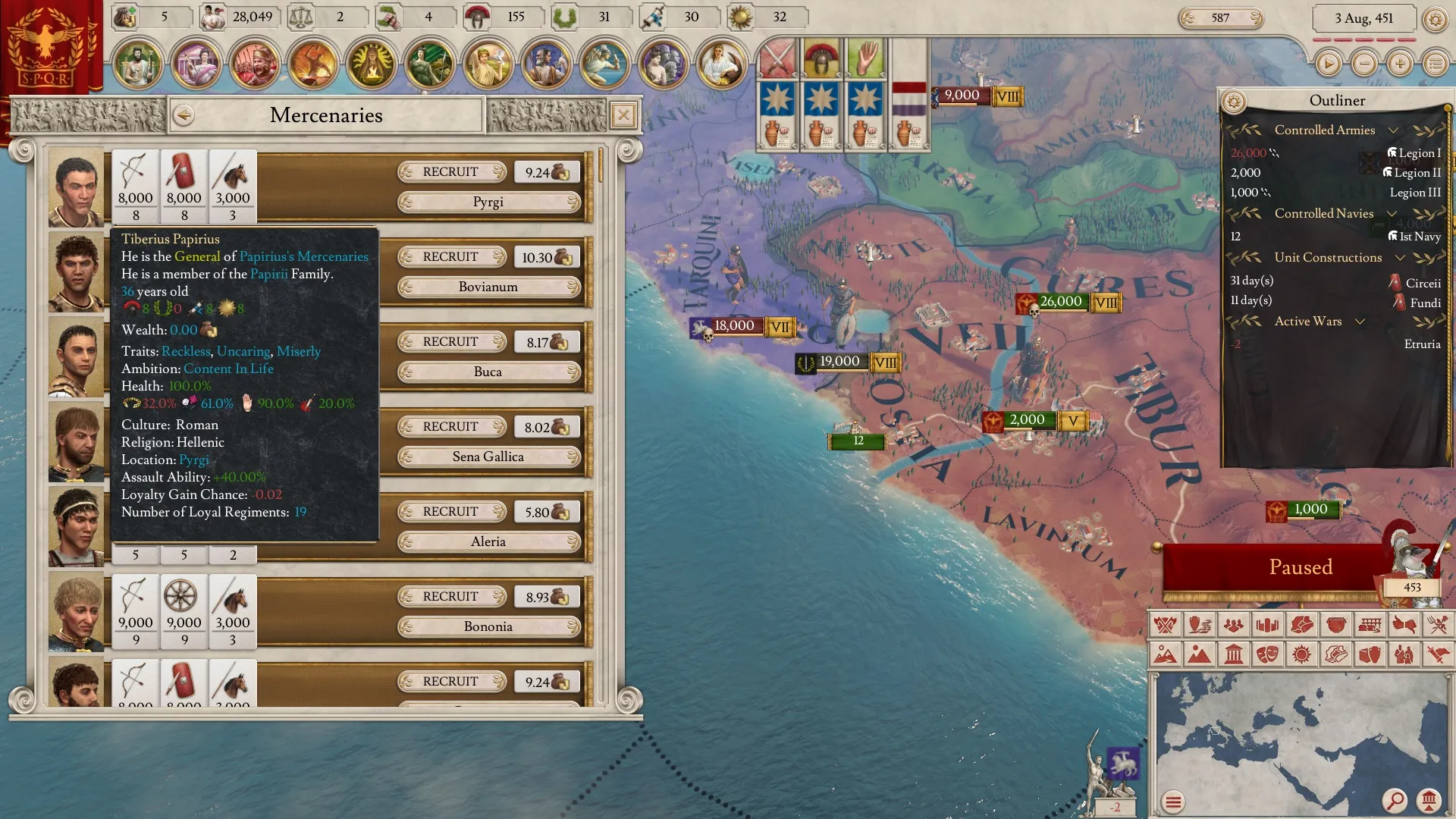 Söldner-Übersichtsbildschirm. Hier kannst du jederzeit sehen, welche Söldner es gibt (sortiert nach Nähe) und wer sie eingestellt hat. Es zeigt auch die monatlichen Unterhaltskosten jeder Söldnergruppe an. Auf der Karte zwischen Rom und Etrurien sind auch die arbeitslosen Söldner von Papirius zu sehen.