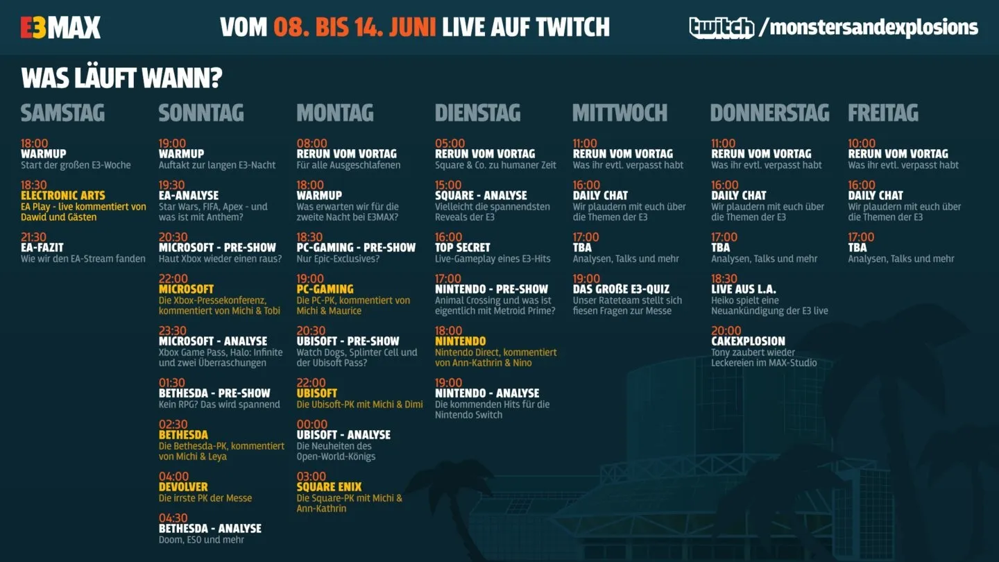 Auf dieser Messe werden meist die großen Titel der kommenden Monate angekündigt. Neben den in Los Angeles stattfindenden Presseevents gibt es für die Gamer der Welt Pressekonferenzen im Netz.