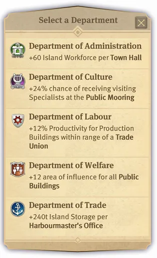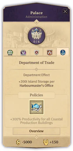 Aber was ist mit den Spielern, denen die Optik egal ist, höre ich einige von Euch fragen? Na gut, dann reden wir mal über Ministerien und Richtlinien! Sobald Ihr Euren Palast konstruiert habt, erhaltet Ihr direkt Zugriff auf ein oder mehrere Ministerien (basierend auf der Attraktivität der Stadt), wobei zusätzliche Ministerien gegebenenfalls freigeschaltet werden können, wenn Eure Insel an Attraktivität gewinnt. Aber was genau machen sie? Zunächst einmal gibt Euch jedes freigeschaltete Ministerium direkt einen permanent verfügbaren passiven Buff, wie zum Beispiel +200 Tonnen Insellagerraum pro Hafenmeisterei (jedes Ministerium ist auf einen bestimmten Aspekt Eures Imperiums spezialisiert, wie Verwaltung, Kultur oder Transport). Darüber hinaus – und hier wird das Ganze dann richtig spannend – gibt euch jedes freigeschaltete Ministerium eine Anzahl von Richtlinien zur Auswahl, von denen jederzeit nur eine aktiv sein kann (wobei Ihr sie jederzeit austauschen könnt). Diese geben Euch zusätzliche Flexibilität und Kontrolle darüber, dass Ihr für jede Situation auf Eurer Insel die Richtige Politik führen könnt.