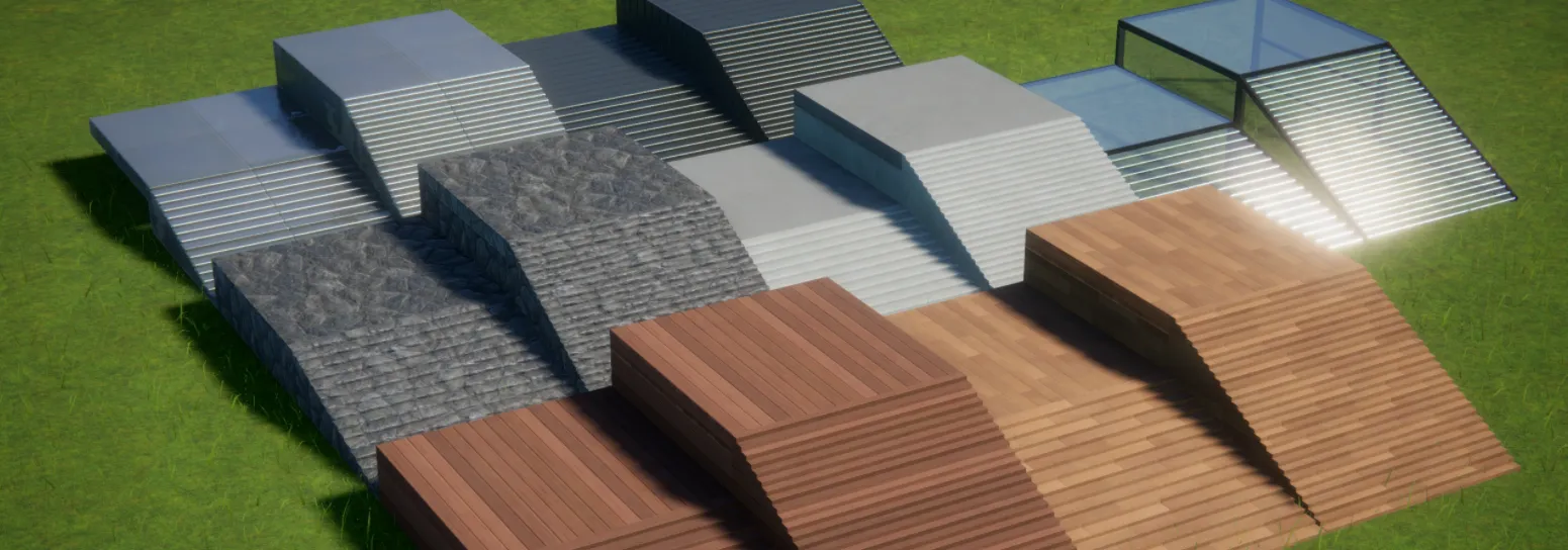 - 1m und 2m Treppen wurden dem "Modularen Wand Baumenü" hinzugefügt. Wie auch bei anderen Gebäudeteilen kann man die Textur der Treppen austauschen und die Größe anpassen.