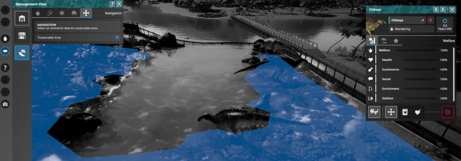 - Eine Navmesh-Vorschau wurde zum Menü der Management-Ansicht hinzugefügt (die über das Dashboard auf der linken Seite des Bildschirms aufgerufen werden kann). Wenn Sie ein Tier auswählen, wird der begehbare Bereich auf der Karte blau eingefärbt. HINWEIS: Dies ist keine fertige Funktion. Im Moment wird die Vorschau nur für einen kurzen Radius um ein Tier erzeugt. Für die Zukunft ist außerdem geplant, das ausgewählte Tier mit einer Highlight-Grafik zu versehen, um die Bedienung zu erleichtern.