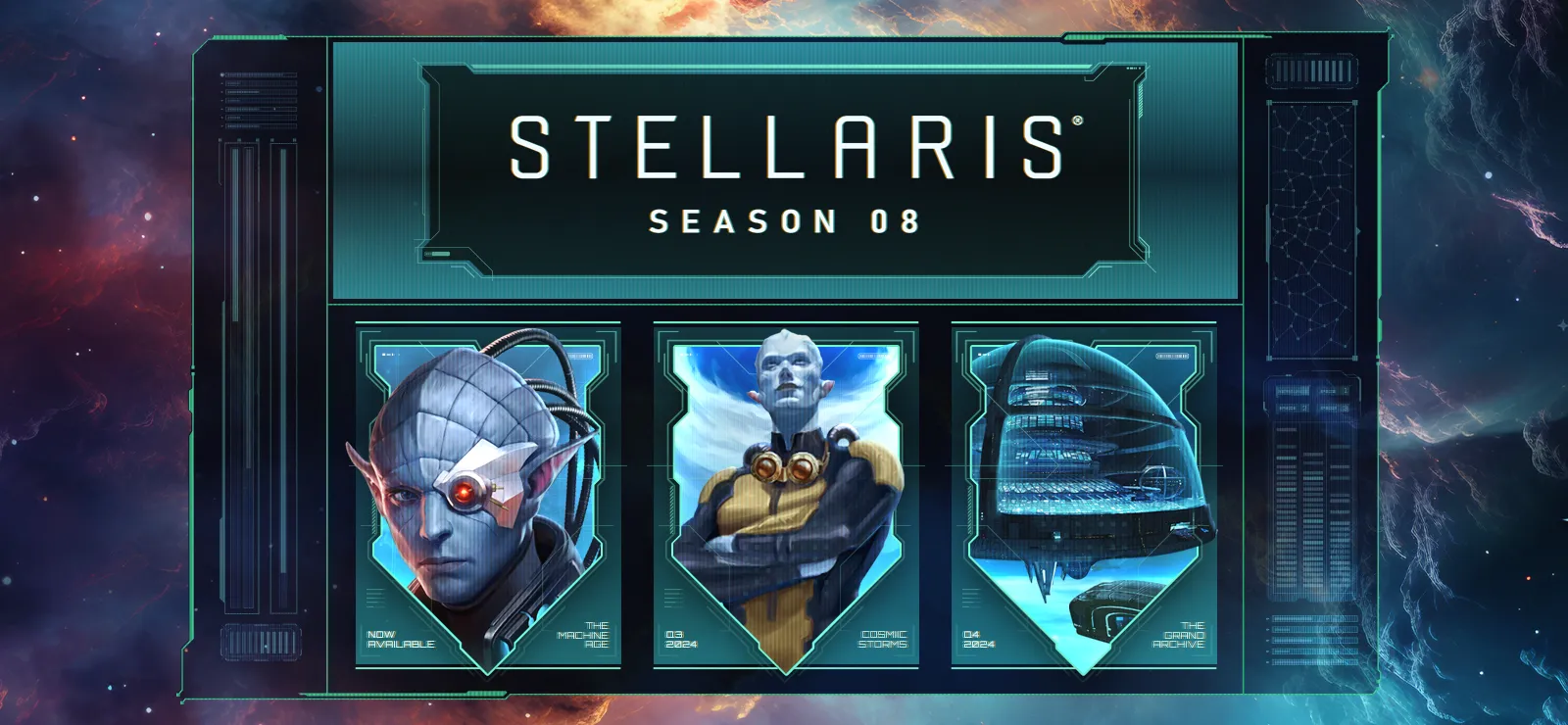 Stellaris: Season 08 enthält The Machine Age (jetzt erhältlich!), Cosmic Storms (erscheint im 3. Quartal 2024) und The Grand Archive Story Pack (erscheint im 4. Quartal 2024). Als Bonus erhaltet ihr außerdem ein neues Rick the Cube Machine Portrait und über 20% Rabatt im Vergleich zum Einzelkauf aller Inhalte!