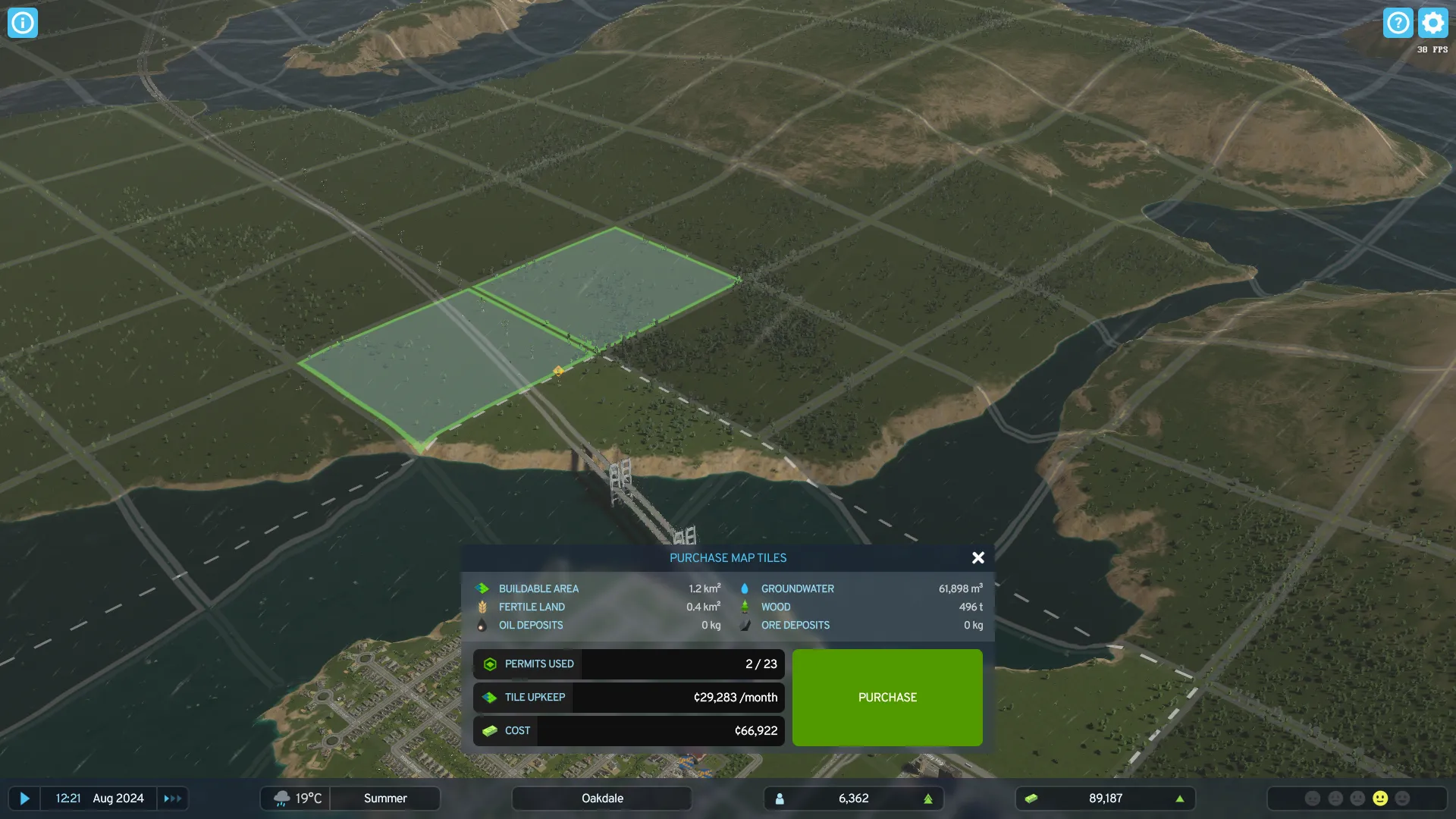 Natürlich wirken sich diese neuen Kosten auf eure Möglichkeiten aus, den Rand des spielbaren Gebiets zu erreichen und neue Außenverbindungen zu schaffen, also lasst uns kurz über die billigste Möglichkeit sprechen, sie früh zu schaffen. Falls ihr es noch nicht bemerkt habt: Die Kosten für Kartenfelder hängen davon ab, was auf ihnen verfügbar ist - bebaubares Land, Ressourcen usw. -, so dass Felder mit viel Wasser am billigsten sind. Daher ist der Kauf von Meeresplättchen die absolut günstigste Lösung, wenn eure Stadt so schnell wie möglich eine neue Verbindung nach draußen braucht. Ihr könnt dann eine Brücke oder eine Rohrleitung an den Rand des spielbaren Gebiets bauen. Ihr könnt auch die Geländewerkzeuge verwenden, um eine realistischere Landbrücke zu erstellen und eine Straße darauf zu bauen, aber bedenkt, dass mehr Land innerhalb des Gebiets die Unterhaltskosten beeinflusst.