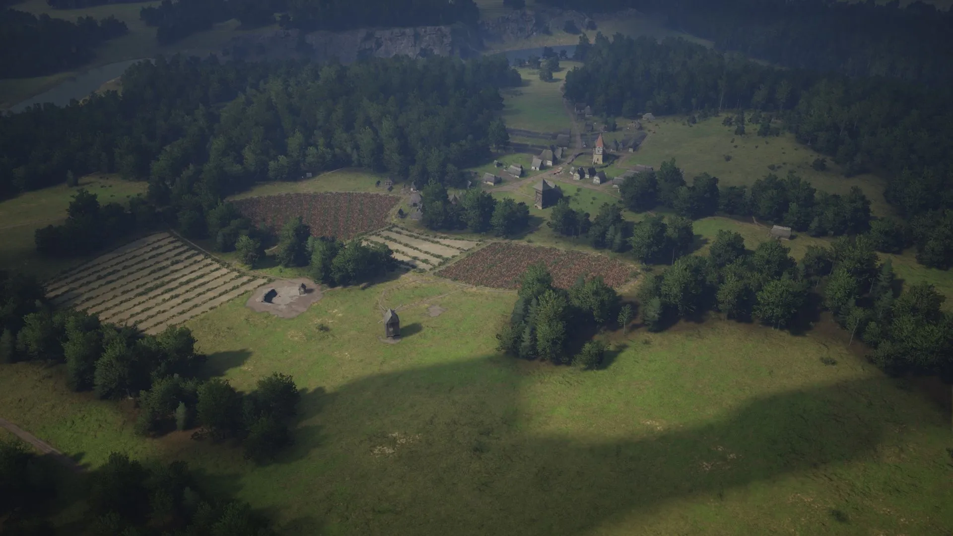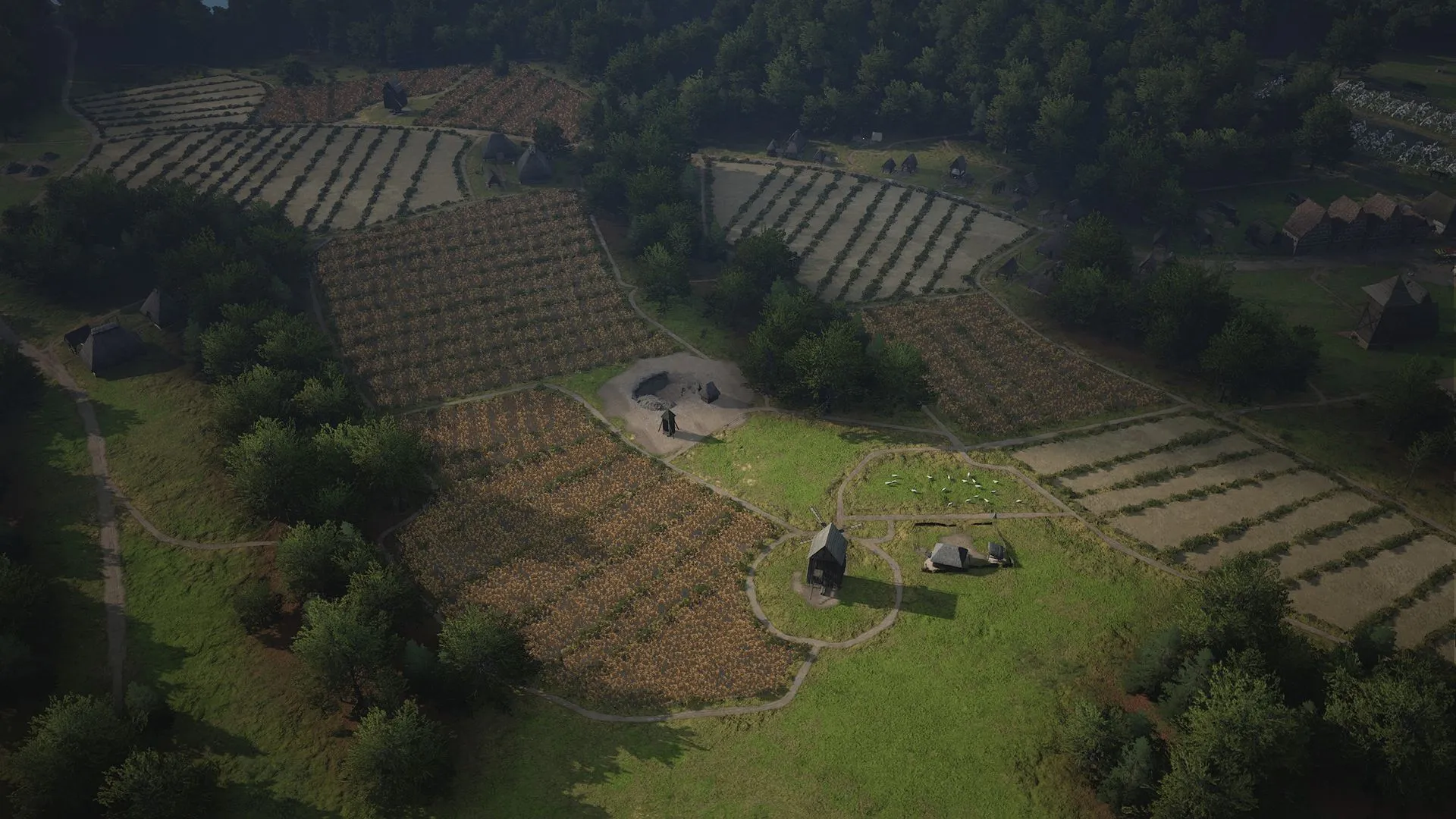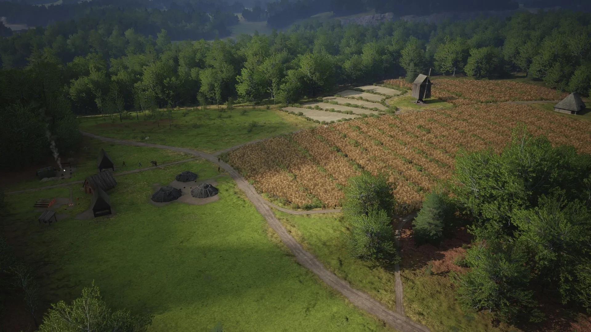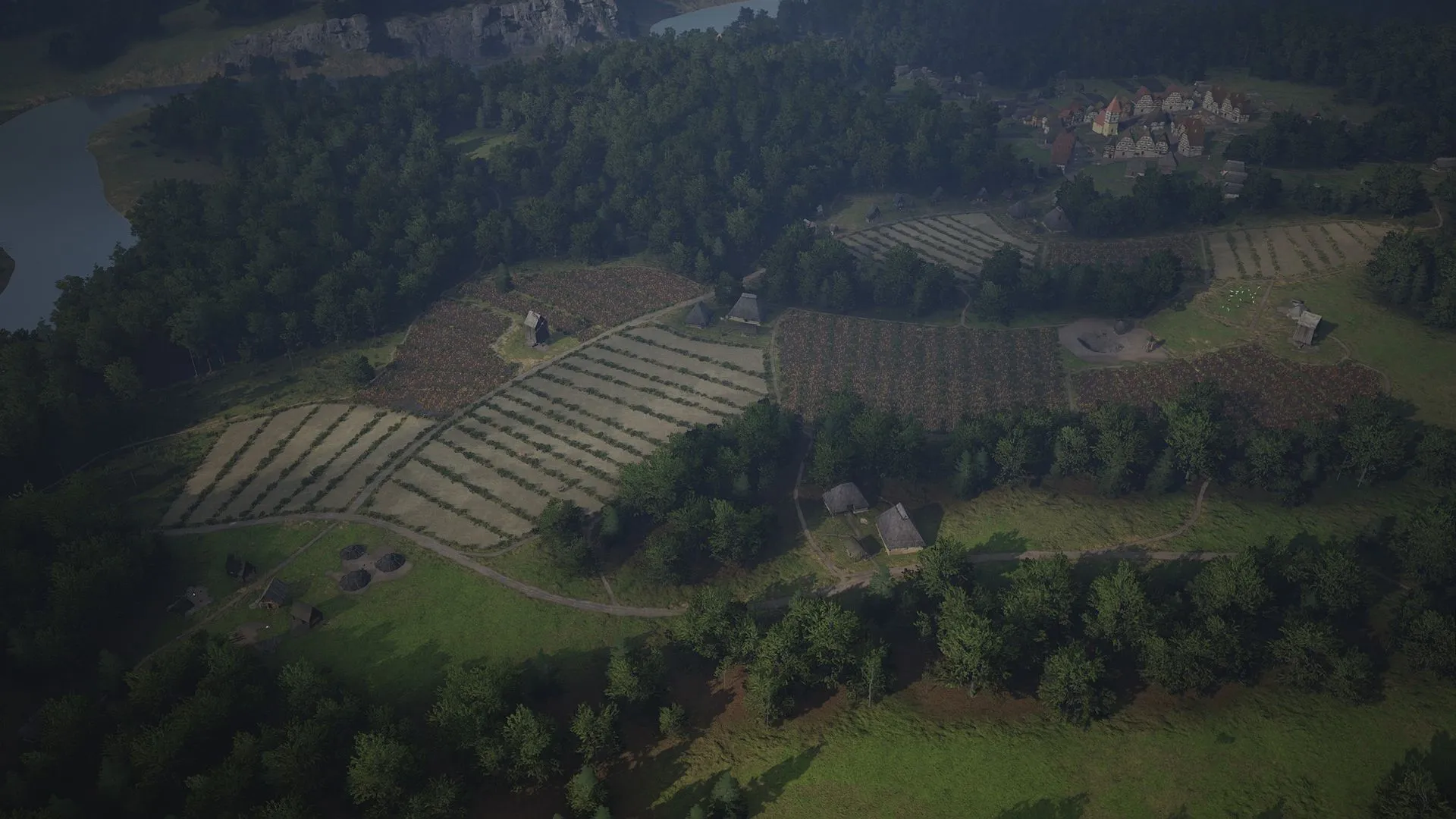 Hier mal der erste Screenshot: Im Vordergrund ein Gerste- und Weizenfeld. Zwei andere Felder liegen brach, die kommen im nächsten Jahr an die Reihe. Windmühle ist klar und links davon ist eine Salzmiene. Mit dem Salz kann ich momentan wenig anfangen da ich kaum Fleisch habe welches zu Würstchen verarbeitet werden kann.
