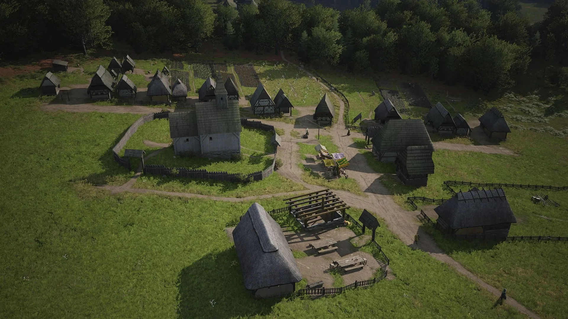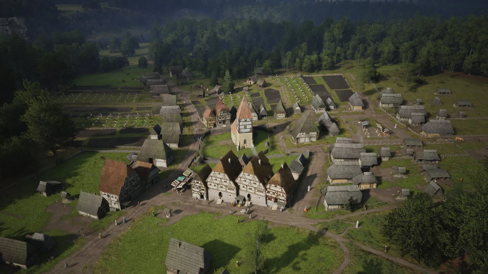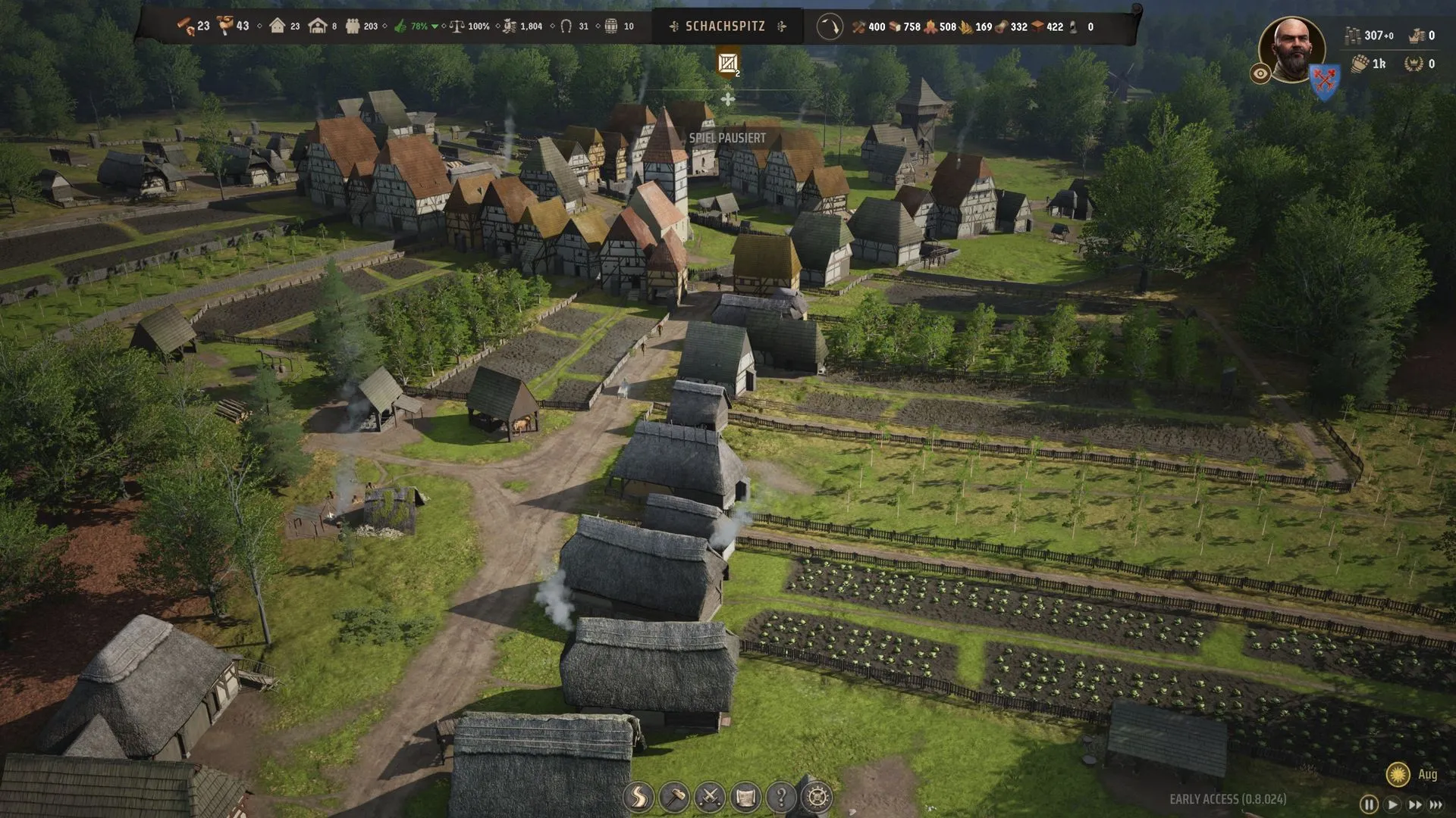 Gehen wir mal näher ran. Im Vordergrund steht mein bescheidenes Herrenhaus. Dann folgen ein paar Häuser der 2. Stufe und meine Steinkirche. Dahinter wieder Bauernhäuser und daran anschließend folgt meine komplette "Holzindustrie" mit Holzfäller, Sägegrube, Brennstoffsammler und Förster. Dahinter folgt noch eine Handelsstation bei welcher ich Bretter verkaufe was mir etwas Einkommen beschert.
