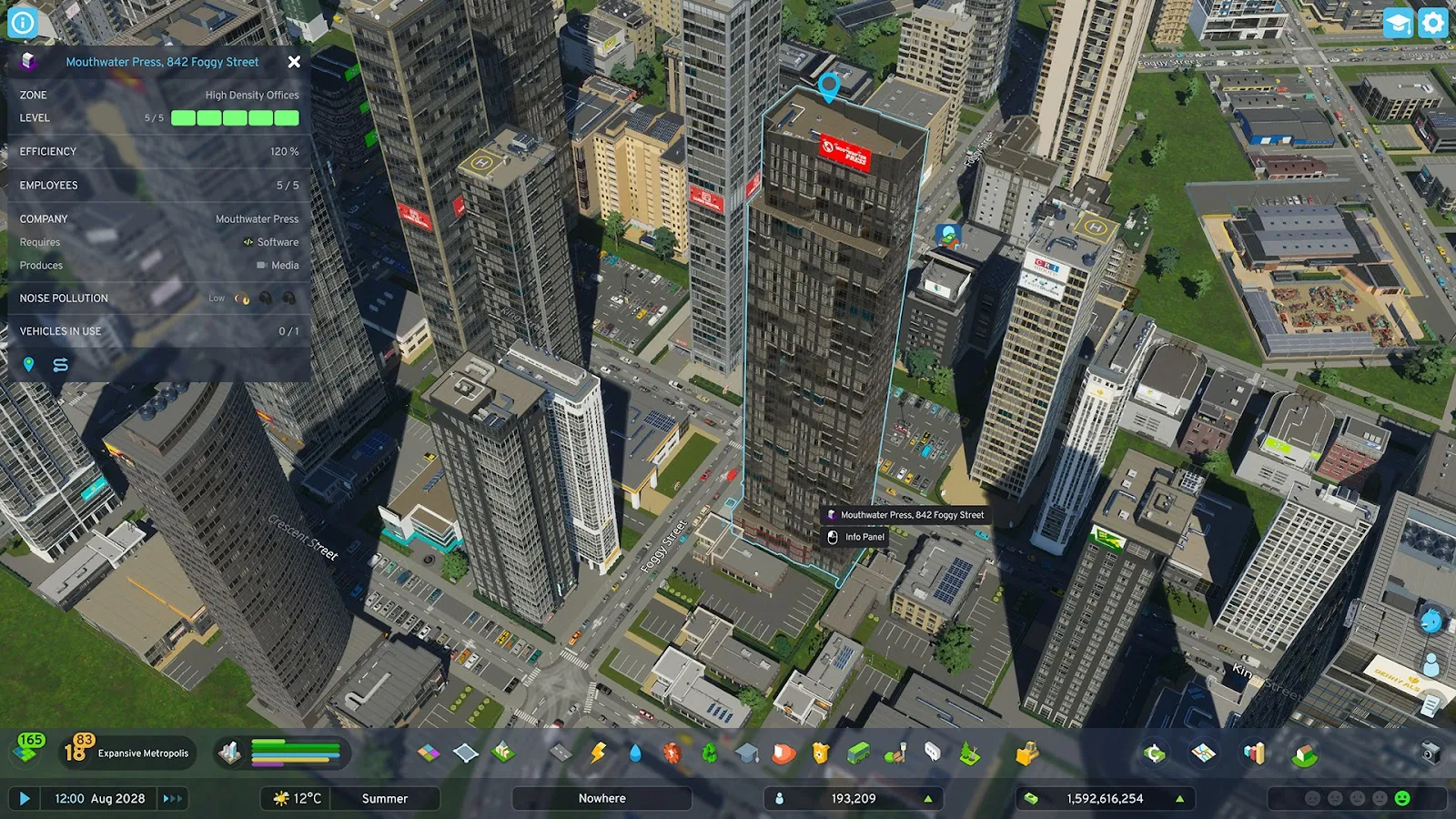 Ein weiteres gutes Beispiel dafür, wie sich ein Ungleichgewicht zwischen Ressourcenproduktion und -verbrauch auf die Stadt auswirken kann, ist das aktuelle Problem, dass Büros ihre Belegschaft auf nur noch 5 Mitarbeiter reduzieren. Personalabbau ist eine Maßnahme, die Unternehmen hilft, in schwierigen Zeiten profitabel zu bleiben. In diesem Fall ist die Nachfrage nach und der Verbrauch von in Büros produzierten Gütern, wie Finanzdienstleistungen oder Telekommunikation, zu gering, um Bürounternehmen in der Stadt zu erhalten. Dies veranlasst sie, so weit wie möglich zu verkleinern, und da 5 Mitarbeiter das absolute Minimum sind, das das Spiel ihnen erlaubt, ist das das Ergebnis.