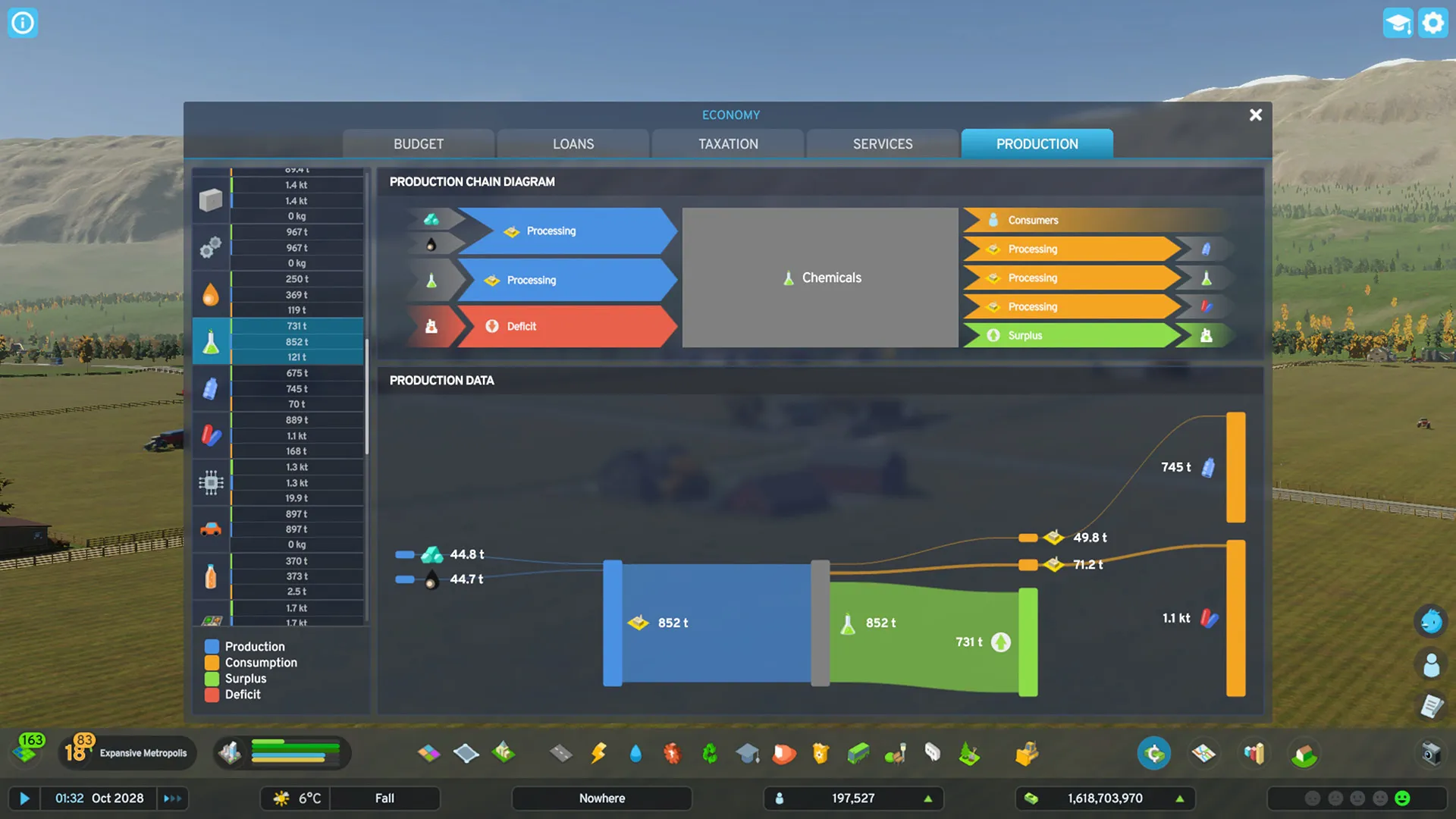 Wir haben uns für ein Sankey-Diagramm entschieden, um die Produktionskette visuell darzustellen. So können wir nicht nur anzeigen, welche Ressourcen in der Produktionskette enthalten sind, sondern auch deren Produktion und Verbrauch in der Stadt, sodass Sie beispielsweise Ihre Produktion von Chemikalien mit deren weiterer Verwendung in Ihren Industrien vergleichen können. Auf der linken Seite des Panels befindet sich weiterhin eine Liste aller Ressourcen im Spiel, die jedoch viel kompakter ist und nun die Produktion (blau), den Überschuss (grün) oder das Defizit (rot) sowie den Verbrauch (orange) anzeigt, wobei letzterer neu in die Liste aufgenommen wurde.