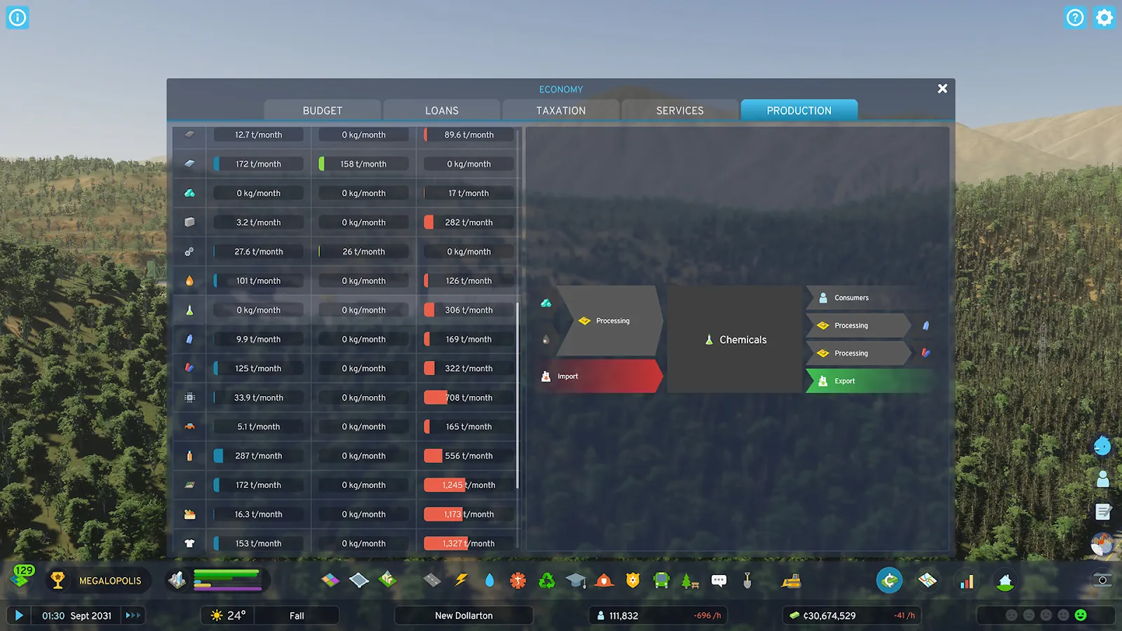 Wir haben 36 Ressourcen in Cities: Skylines II: 10 Rohstoffe, 18 materielle Güter und 8 immaterielle Güter. Diese interagieren auf verschiedene Weise miteinander, und ihre Kauf- und Verkaufswerte beeinflussen die Wirtschaft der Unternehmen in Ihrer Stadt und damit auch die Wirtschaft eurer Stadt. Die Neugewichtung der Ressourcen ist keine leichte Aufgabe, aber die neue Registerkarte „Produktion” erleichtert es unserem Designteam erheblich, die Änderungen zu verfolgen und Ausreißer zu erkennen, die angepasst werden müssen.
