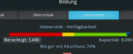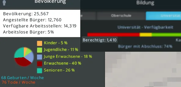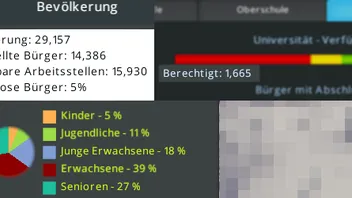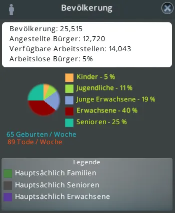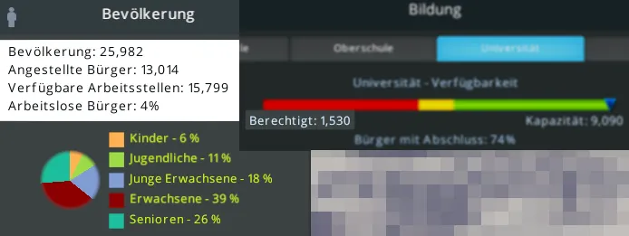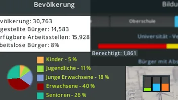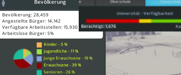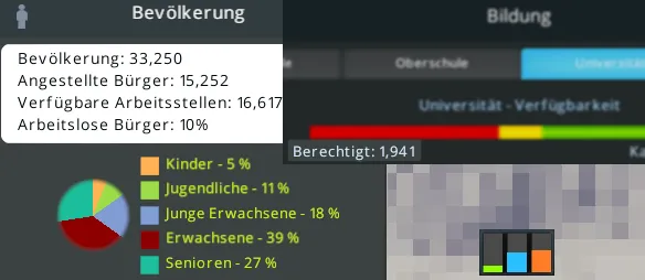 Zu diesem Zeitpunkt hatte ich 33.361 Einwohner, 17.397 Erwerbstätige, 14.727 "Angestellte Bürger" und somit 2.670 Arbeitslose. Dann hatte ich die 16.114 Verfügbare Arbeitsstellen, was 1.387 "Freie Stellen" ergibt. Daher gab es für 1.283 Bürger keine Stellen, die an sie vermittelt werden konnten.