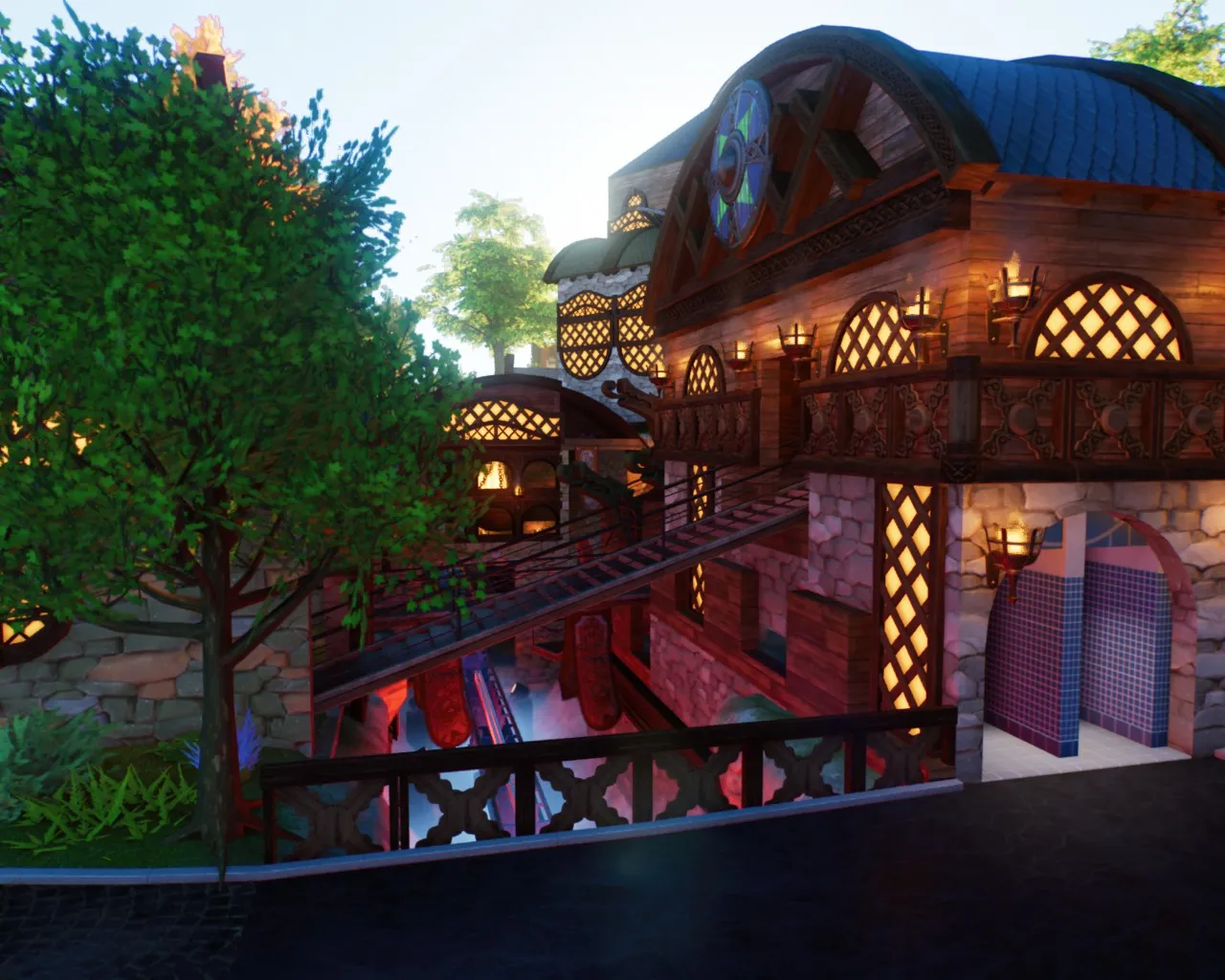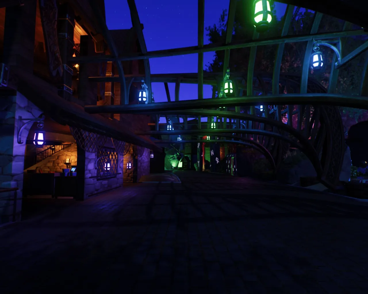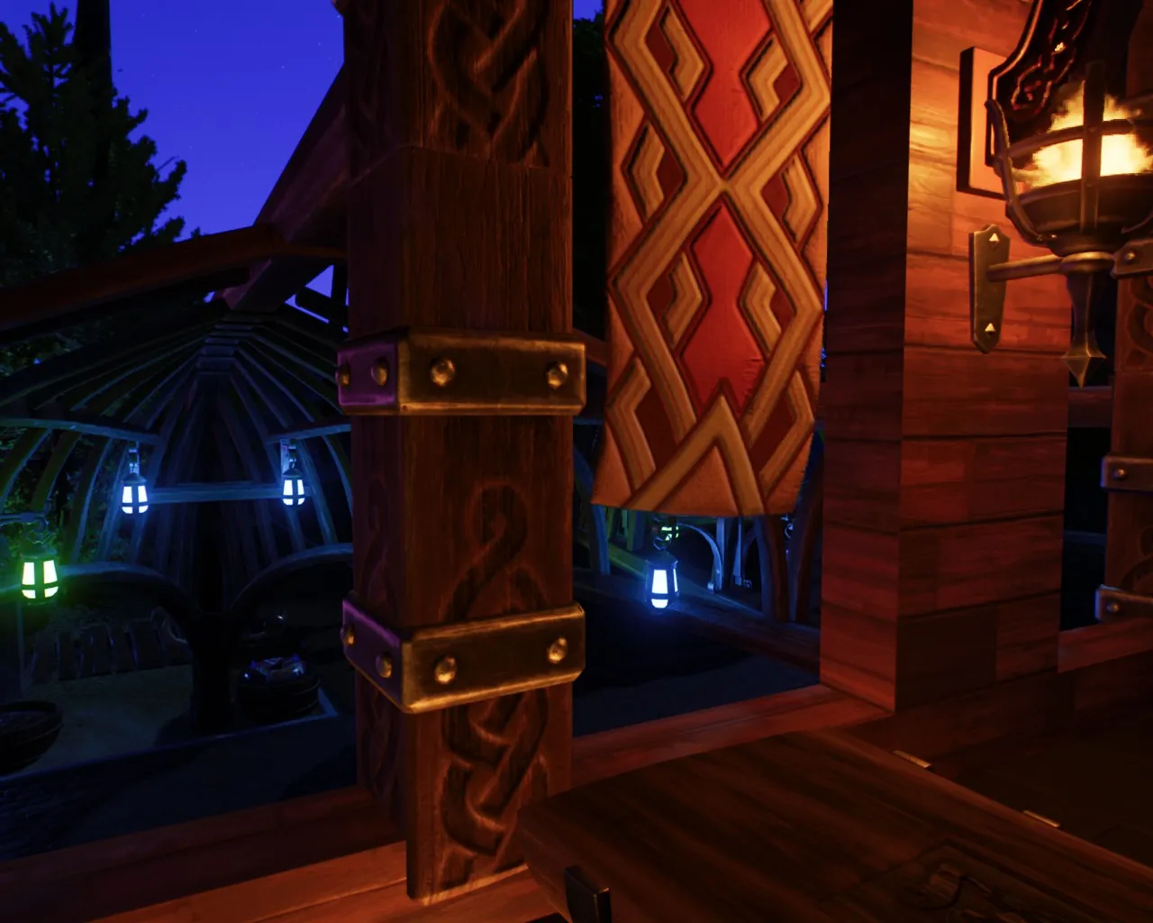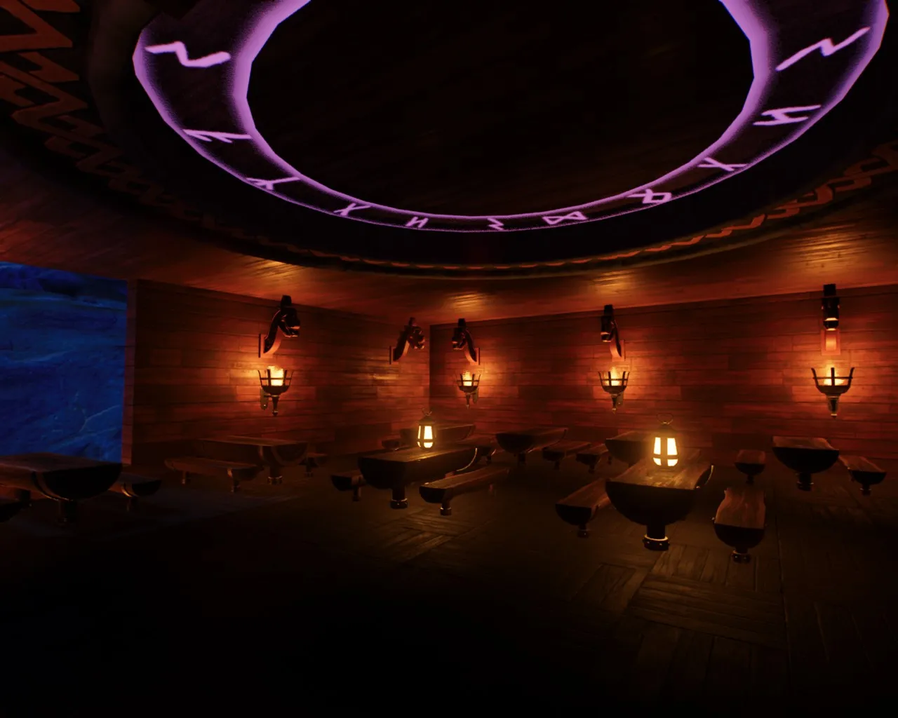 Der Bereich vorm Fjord Restaurant leuchtet in düster dunklen Charme