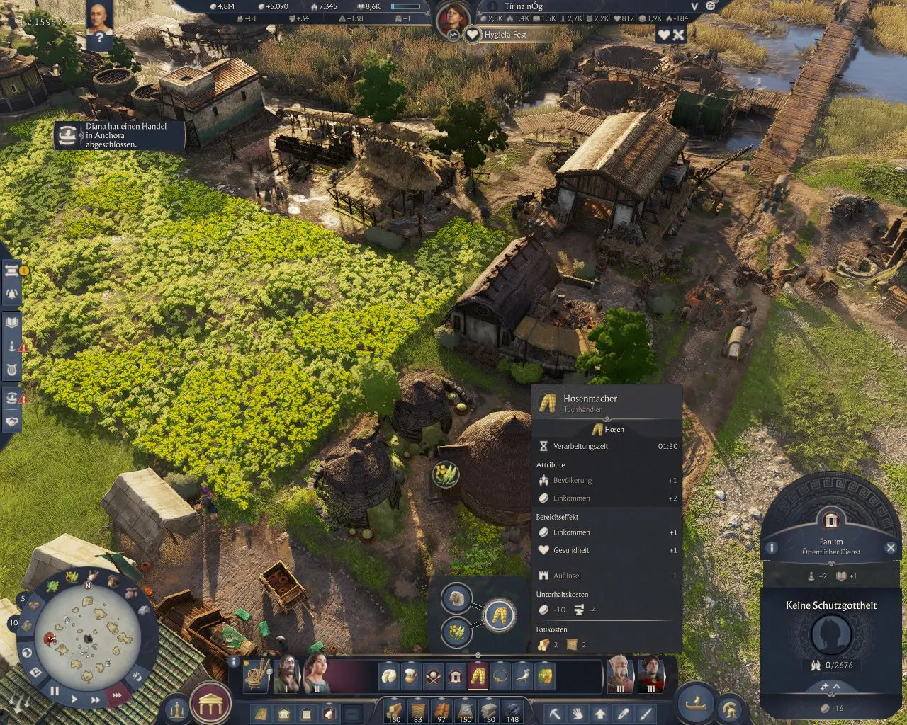 Käse, Bier, Hosen, Torques, Schildschläger und Trinkhörner sind die Grundbedürfnisse der Bevölerungsstufe Schmiede, dazu kommt noch die Wettkampfwiese und Fanum als platzierbare Gebäude. Die zweite Bevölkerungsstufe benötigt nun auch neue Materialien: Ziegel und Flechtwerk.