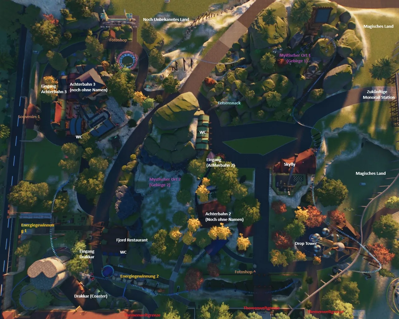 Das klingt doch vielversprechend mit dem Wilden Western. Wenn du willst kannst du die Monorail auch bis in deinen Bereich ziehen, um auch eine Station bei dir zu haben (Die Monorail Strecke ist nicht an die neue Zonenaufteilung angepasst, grundsätzlich gilt hier, was auf deinem Grundstück ist, kannst du bebauen.