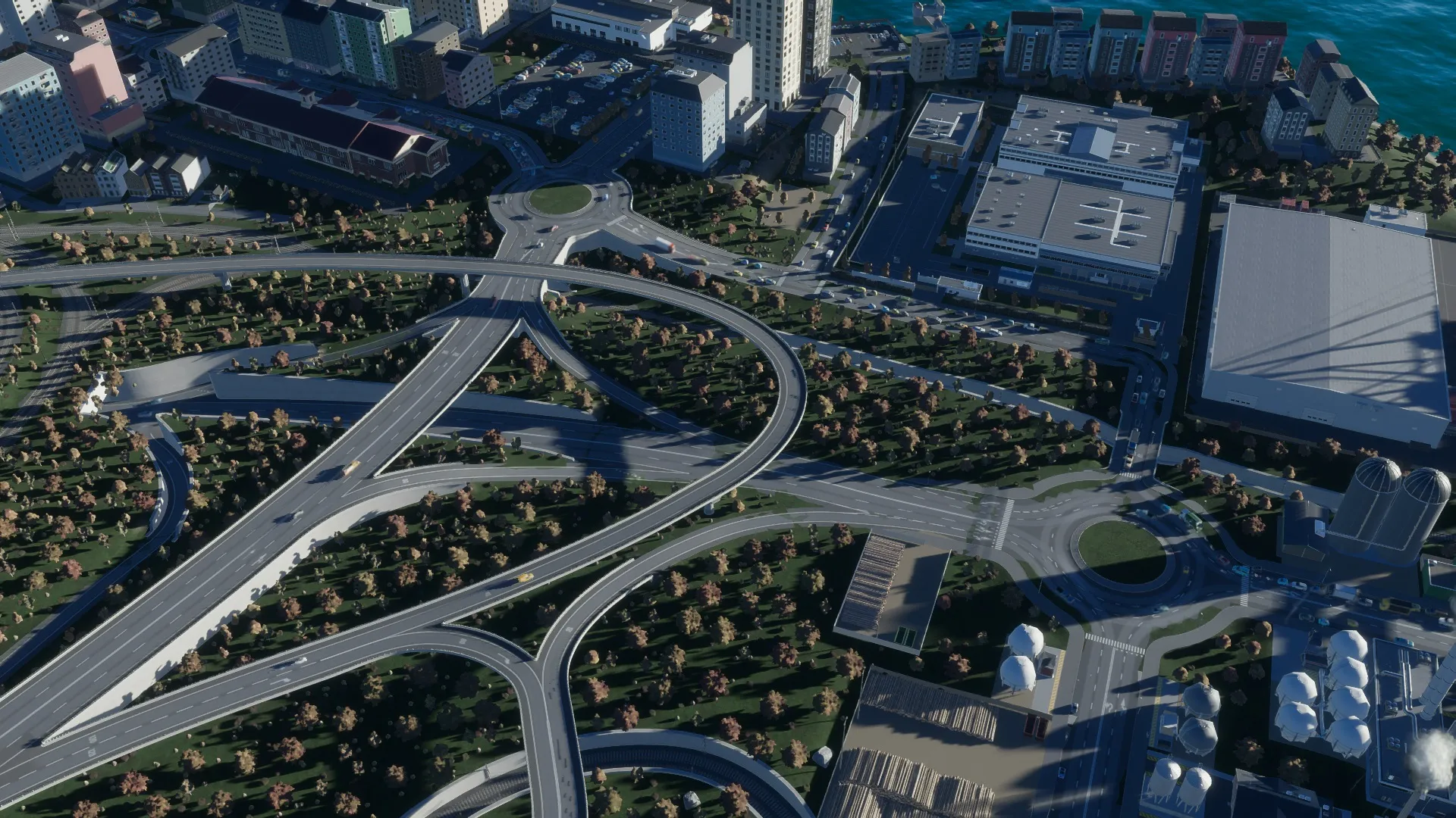 Hier mal ein Ausschnitt von einer meiner verknoteten Kreuzungen. Zugzugang zu drei Frachthäfen, von der Autobahn zur Industrie und ins Wohngebiet. Manche Kreuzungen sind Evolutionär, entwickeln sich erst beim machen